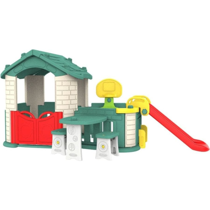 Ramiz Duży Domek ogrodowy 5w1 dla dzieci + Zjeżdżalnia + Koszykówka + Ogródek + Stolik + 2 Krzesełka Zielony Dach